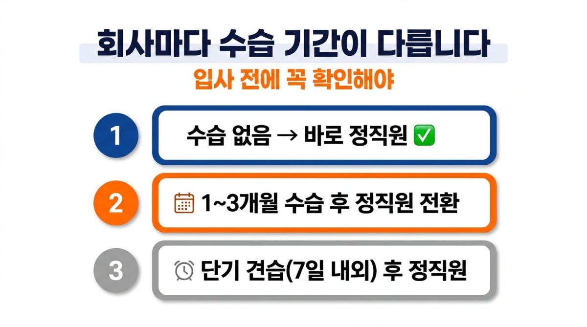 수습 없이 바로 정직원인 곳, 1~3개월 수습 후 정직원 전환하는 곳, 견습 운행만 하고 바로 정직원인 곳.