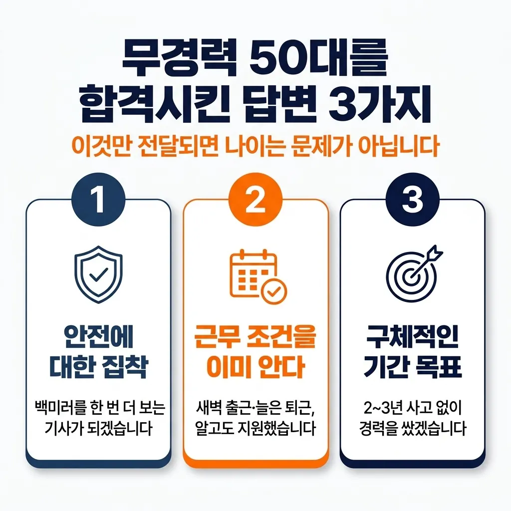 저는 이렇게 답했습니다. "운전 실력보다 승객의 안전을 먼저 확인하며 백미러를 한 번 더 보는 기사가 되겠습니다." 면접관이 원하는 답은 잘 운전한다는 말이 아닙니다. 사고 없이 오래 다닐 사람이라는 확신을 주는 것이 먼저입니다.